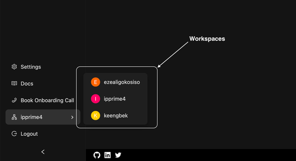 If you're a member of multiple workspaces, you can switch between them by clicking the workspace name in the lower left corner of the screen. Remember, all applications in a workspace are shared among all its members.